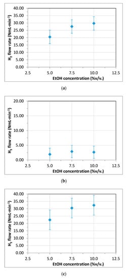 Effect of ethanol concentration in co-reforming experiments (T = 450 °C, P = 5.0 bar, feed: 15 g/h mixture OMW–EtOH and 15 mL/min N2): (a) permeate, (b) retentate, and (c) total produced hydrogen.