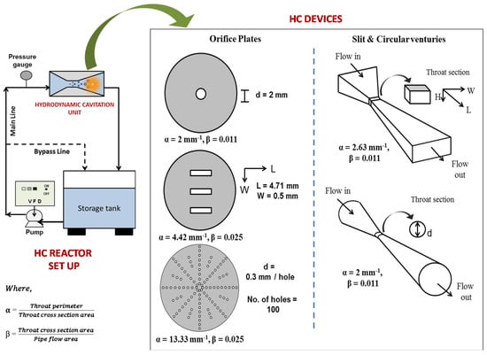where P2 is the fully recovered downstream pressure, Pv is the saturated vapor pressure of the liquid, ρ is the density of the liquid, and V is the average velocity of the liquid at the constriction. The initiation of cavitation starts at a threshold cavitation number known as the cavitation inception number. With an increase in inlet pressure, the volumetric flow rate through the orifice increases, and the velocity at the constriction of the orifice also increases, resulting in a decline in cavitation number. Generally, cavitation occurs at Cv 1, but cavities can also be formed at a value greater than 1 owing to the presence of dissolved gases and other solid particles in the liquid [7]. The HC setup and hydrodynamic cavitating devices, as shown in Figure 1, are non-rotating devices, and the intensity of a cavity collapse or the cavitational yield depends on the geometry of the cavitating device. The number of cavities that are being generated, residence time of cavities in the low-pressure region, and the cavity collapse pressure can be affected by the change in the geometrical parameters, such as throat area, throat perimeter, size and shape of the throat, geometrical configuration (venturi or orifice), and convergent and divergent angle of the venturi [8]. Many researchers have reported that the geometrical parameter “α”, which is the ratio of throat perimeter to the throat cross-sectional area, should be kept high for higher cavitational yield. The α can be increased either by changing the shape of the throat, i.e., rectangular or elliptical shapes can be used instead of circular, or by increasing the number of holes of smaller sizes [9]. It has also been reported that the venturi-based HC devices produce better cavitational yield than the orifice plates, since venturies produce more cavities and allow cavities to grow to maximum size before they collapse, due to the smooth recovery of pressure in the downstream. Venturies produce stable cavitation and are mainly used for carrying out chemical transformations, such as wastewater treatment. On the other hand, orifice-based HC devices produce transient cavities due to the sudden pressure recovery in the downstream, and therefore are mainly used for applications where high shear is required, such as emulsification, particle size reduction, and mass transfer-driven chemical reactions [8,9].