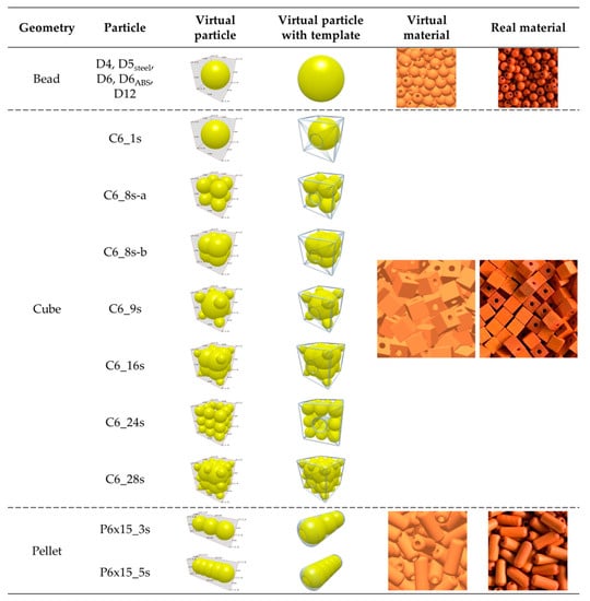 One of the most commonly used methods for describing complex particle geometries is to merge multiple spherical surfaces to form a more complex particle (clump). Due to the grain shape of our selected particulate materials, this paper focuses on the shape accuracy of the P6 × 15 wood pellets, particularly the C6 wood cubes, which represent a considerable challenge for defining the optimum shape. For this reason, a number of different virtual particles were created for these two particulate materials, the use of which will be investigated in terms of storage, flowability and computing time. Figure 2 shows an overview of the shapes of the created virtual particles used in the following experiments. The abbreviation system of virtual particles is as follows: particle_number of spheres which the particle is made of-variation; e.g., C6_8s-a means a C6 particle made by 8 particles clumped in variant a.