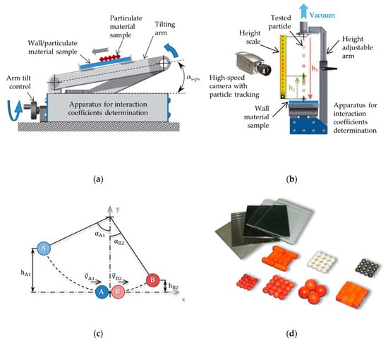 The interaction coefficients define how particles of particulate matter interact with each other or with other materials in contact. The three basic DEM interaction coefficients used in the Hertz-Mindlin contact model include the coefficient of static friction μs, the coefficient of rolling friction μr and the coefficient of restitution e. While some values of these interaction coefficients (e.g., static friction between a particle and a contact material) can be measured quite easily using test apparatus, the experimental determination of the coefficients defining interactions between the particles themselves (and their subsequent use in DEM) is often challenging. In order to measure all three interaction parameters, a test apparatus designed with regard to accuracy and simplicity of measurements was constructed. To measure the coefficient of restitution, the device features a height-adjustable arm with a head. A vacuum source can be connected to this head, allowing one to suck a test particle onto a fine screen of the head. The tilting arm controlled by a screw facilitates a fine pitch for smooth operation serves to measure the friction parameters.