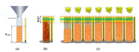 Particles packed in a bed are probably the simplest state of particulate matter, which is present both in nature and in a number of industries. The understanding of the particle deposition is also important in industrial applications due to the particle compaction (which is utilized in powder metallurgy), and the characterization of porosity, since air permeability and thermal conductivity of particulate materials can be quantitatively linked to the pore content and inter-particle contact properties. The bulk density verification parameter was the bed height of a particulate material of a known number of particles in a cylinder during the experiment and the DEM simulation. Differences in the resulting height can be resolved by shape accuracy and particle size. The weight of each individual DEM particle was always identical to the weight of actual particles according to Table 3. The second use of the packing test is the initial estimation and determination of the friction parameters μs and a μr, as the values of static and rolling friction affect the height of a bed []. A 1000 mL cylinder, stand, hopper, length gauge, tripod camera and slide shutter were used for the packing test. Each of the seven particulate materials was gradually placed in the hopper above the measuring cylinder and closed by the slide. The slide was then removed, and the material was freely poured into the cylinder. The camera took a photograph which was later used for reading the height of the material bed using the length gauge that was part of the apparatus and was placed in a vertical plane intersecting the axis of the cylinder. This procedure was repeated ten times for each material. From these ten values, the average was determined including the standard deviation. Based on DEM, the computational cost re-calculated to seconds per particle was also recorded as a possible criterion for the subsequent selection of shape accuracy for C6 and P6 × 15 particles. Material constants shown in Table 2 and specific densities of particles in Table 3 were used as input parameters. The scheme and principle used for the packing test are shown in Figure 4.