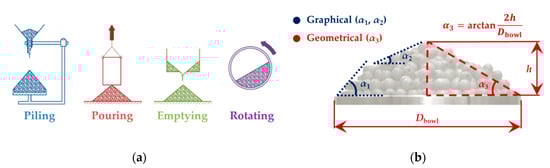 AoR of particulate material is influenced by many factors, such as the static and rolling frictions of particles, particle sizes and shapes, the quantity of material used during measurement and the measurement method (see Figure 5a). It is necessary to choose a particular measurement method based on the application, since each method provides slightly different AoR values. Particular materials were chosen for the experiments with regard to their grain shape so it would be possible to evaluate the advantages and disadvantages of the individual methods. The “piling” and “rotating” methods (see Figure 5a) proved to be the most universal and most credible for the determination of the AoRs of particular materials. If simple conditions are observed, these methods are able to provide high quality AoR values for a wide range of bulk materials. Angle of repose has been widely discussed in the literature for many decades and has been researched by many scientists, even outside of the process engineering field. This issue is first to be divided into two parts: (1) a study of how a pile of particulate material is formed; and (2) how the angle of repose is determined. Piling, pouring, emptying and slowly rotating in a drum leads to the determination of the static angle of repose. The dynamic angle of repose may be obtained in a rotary drum at higher rotational speeds []. Each of these methods in a way influences the resulting angle of repose.