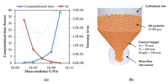 where R is the particle’s radius, ρ its density, G the shear modulus and ν the Poisson’s ratio. This formula assumes that the relative velocity between contacting particles is very small. Other than for quasi-static systems, in practice some fraction of this maximum value is used, and for high coordination numbers (4 and above) a typical time step of 20% Δtmax has been shown to be appropriate. For lower coordination numbers, 40% Δtmax is more suitable []. Choosing a suitable time step represents a compromise between the computational complexity/time, calculation error and simulation stability. Generally, the time step ranges between 20% and 80% of the critical time step according to Rayleigh. With regard to the duration of the calculation and its accuracy, a value of about 30% Δtmax was chosen for all simulations. In the proposed experiment, the influence of the shear modulus value on the process of discharging a hopper was investigated. A virtual cylindrical hopper with a conical discharge hopper of a 50 mm diameter was modelled. The conical hopper of a height of 100 mm was connected to the cylindrical part of a diameter of 100 mm. The experiment was performed for 15,000 pieces of D6 particles generated into the hopper. Subsequently, the flow rate of particles from the discharge hopper and the simulation calculation time were monitored for 5 s.