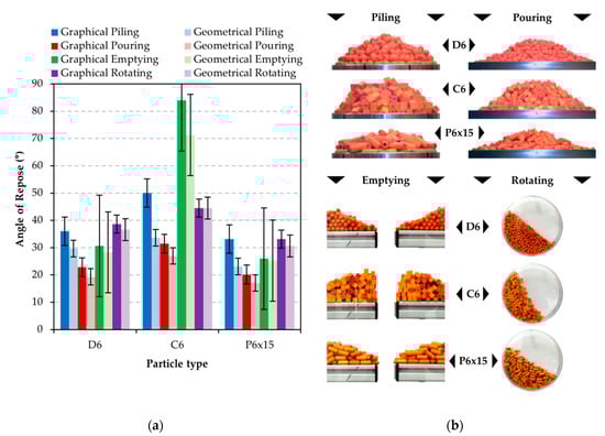 Figure 7a,b show the results of all experiments with wood particles of different shapes. Some of the methods prove to be unsuitable for certain shapes and sizes. For example, for the “piling” method, the bowl is too small for the P6 × 15 particles and the particles are unable to form a proper cone to measure the angle of inclination. The evaluation of this method by an operator is then a highly subjective. Moreover, the “emptying” method proved to inappropriate for C6 particles, since we observed bridging above drain hole or the strong core flow, when only the particles above the drain hole were dropped, creating a slope angle of almost 90°.