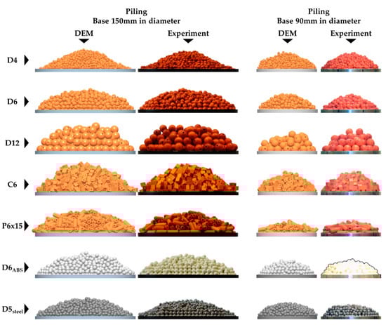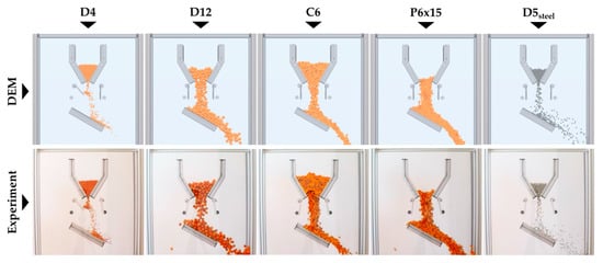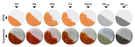 The results of calibration experiments for the determination of the static angle of repose are shown in Figure 8 and Table 14 and Table 15. Materials D4, D6, D12, P6 × 15 and D6ABS kept their experimentally measured input parameters. For material C6, the value of the rolling friction coefficient was adjusted from 0.50 to 0.15; for material P6 × 15 the value of rolling friction was changed from 0.06 to 0.03, while the value of static friction between particles was changed from 0.40 to 0.25. Similarly, for steel spheres D5steel, the value of rolling friction was adjusted from 0.02 to 0.03, and the value of static friction between particles from 0.17 to 0.30.