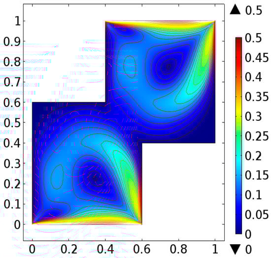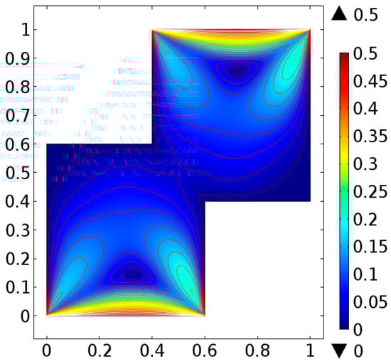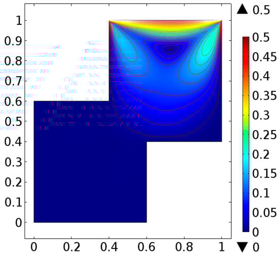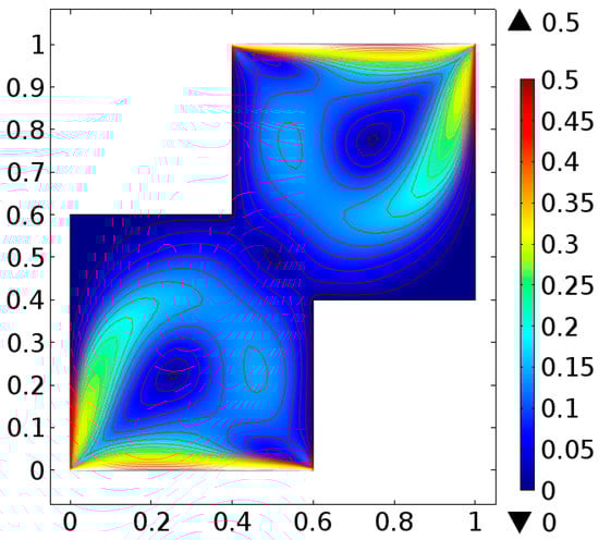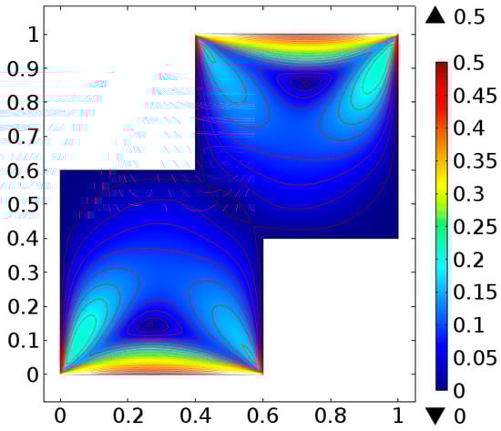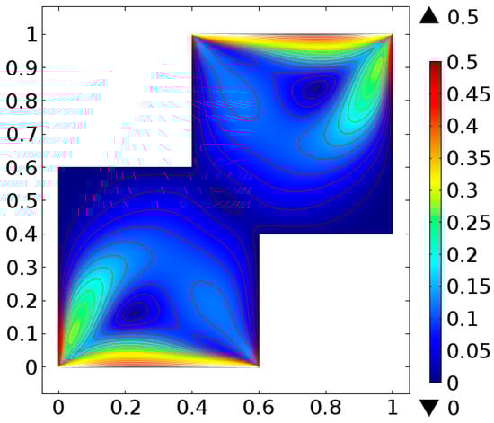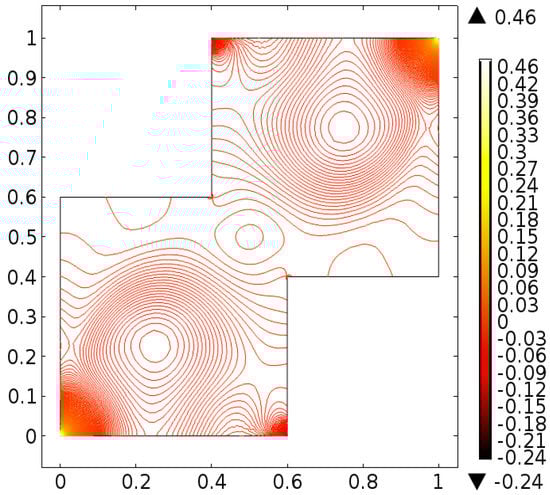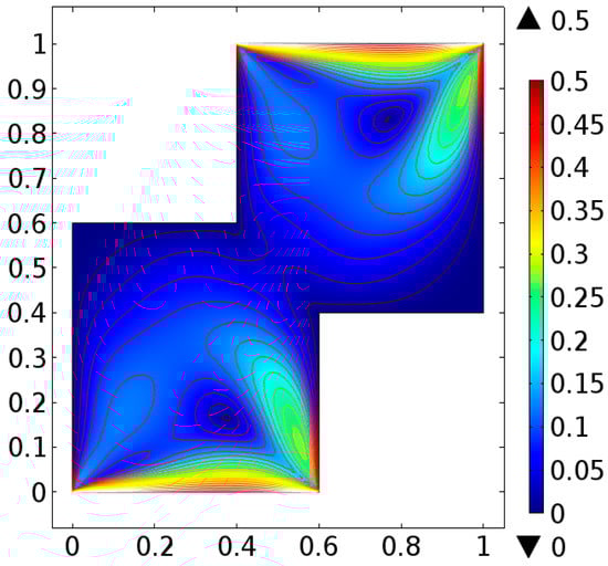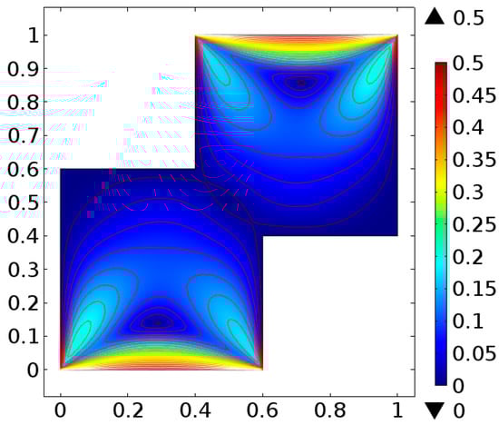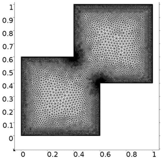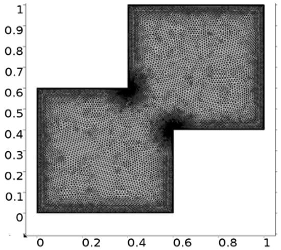 The fluid flow narrating differential equations in a staggered enclosure are Equations (10) and (11) along with the boundary constraints provided in Equations (12)–(14) are solved numerically. For better novelty, the staggered cavity as a computational domain is discretized in nine different refinement levels. The lowest refinement level divide the cavity into 332 domain elements and 44 boundary elements.