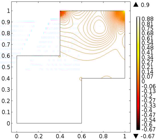 The geometric illustration is offered in Figure 2. The level two in which the computational domain consists of 450 domain elements and 56 boundary elements is disclosed in Figure 3. The refinement level three is consists of 72 boundary elements and 724 domain elements is given in Figure 4. The four level consists of 108 boundary elements and 1272 domain elements and it is displayed in Figure 5. The Figure 6 shows that the level five consists of 1884 domain elements and 136 boundary elements. The six refinement level consists of 2950 domain elements and 172 boundary elements as illustrated in Figure 7. The level seven consists of 7248 domain elements and 340 boundary elements as shown in Figure 8. The Figure 9 depicts the level eight which consists of 18,664 domain elements and 652 boundary elements. Lastly, the highest level is the extremely fine which divides the cavity into 24,014 domain elements and 652 boundary elements is shown in Figure 10. The primitive variables namely, the velocity and pressure are evaluated at level-9 for all cases. The first case includes the motion of top wall with velocity and rest of walls are taken zero. The key to the graphs for this case are as follows: Figure 11 is velocity distribution at Re = 50. The velocity plot at Re = 100, Re = 400 and Re = 1000 are offered in Figure 12, Figure 13 and Figure 14 respectively. The pressure distribution at Re = 50, Re = 100, Re = 400 and Re = 1000 are provided in Figure 15, Figure 16, Figure 17 and Figure 18 respectively. For better insight the line graph study is executed to examine the u and v velocity profiles against variation in µ = 0.02 (Re = 25), µ = 0.01 (Re = 50), µ = 0.0025 (Re = 200), and µ = 0.001 (Re = 500). Such output is offered in Figure 19 and Figure 20. In detail, the velocity distribution in staggered cavity is examine at Re = 50 and the outcome is displayed in Figure 11. It is noticed that the streamlines near the top wall has maximum visibility and there are two secondary vortices appears in the left and right corners of the top wall. There is only one primary vortex appear at the center of upper region. Further, for Re = 100 there is a trifling change in the streamlines of the secondary vortices, see Figure 12. For Re = 400, the secondary vortex in right corner has prominent as compare to the secondary vortex in the left corner see Figure 13. The velocity distribution is examined at Re = 1000 and the one primary vortex is observed. The Figure 14 is plotted in this direction. One can note that the increase in Reynolds number cause prominence of secondary vortices. The corresponding pressure evaluation is recorded for Re = 50, Re = 100, Re = 400 and Re = 1000. In detail, Figure 15 is pressure distribution at Re = 50. It is noticed that the pressure seems maximum at corners of top wall. The Figure 16, Figure 17 and Figure 18 are pressure plots for Re = 100, Re = 400 and Re = 1000 respectively. It is noticed that the higher values of Reynolds number cause increase in pressure at top corners of staggered cavity.