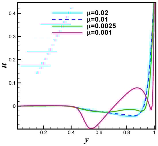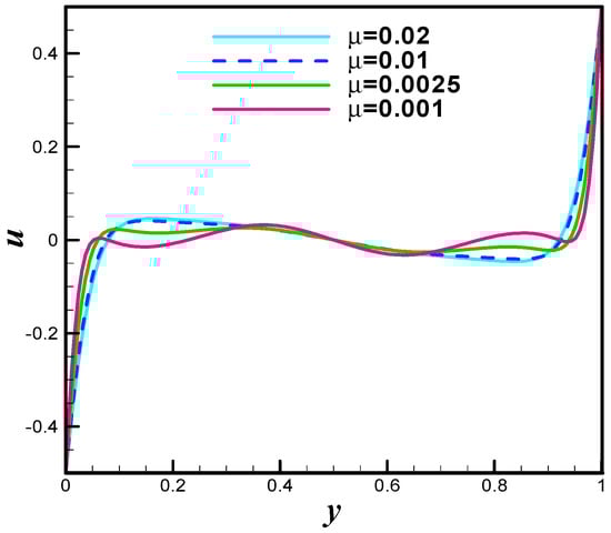 The velocity distribution when top and bottom walls are moving antiparallel is observed at Re = 400 and Re = 1000. The Figure 33 and Figure 34 are plotted in this direction. It can be noticed from Figure 33 that the central region vortex shrinks by increasing Reynold number that is Re = 100. At Re = 1000, the primary vortices becomes dominant and vortex at central region of staggered shrinks significantly. The pressure plots when both walls namely upper and lower are moving antiparallel are offered at different values of Reynolds number that is Re = 50, Re = 100, Re = 400 and Re = 1000. Particularly, Figure 35 is pressure plot at Re = 50. Figure 36 is pressure plot at Re = 100 while the Figure 37 and Figure 38 are pressure distribution at Re = 400 and Re = 1000 respectively. Collectively, one can see that the pressure distribution becomes higher in strength against increasing values of Reynolds number. The line graph study of velocity distribution when walls are moving antiparallel is performed for both u and v components. In detail, the Figure 39 is u-velocity line graph at µ = 0.02 (Re = 25), µ = 0.01 (Re = 50), µ = 0.0025 (Re = 200), and µ = 0.001 (Re = 500) while Figure 40 offers the v-velocity line graph study towards µ = 0.02 (Re = 25), µ = 0.01 (Re = 50), µ = 0.0025 (Re = 200), and µ = 0.001 (Re = 500). The trifling sinusoid variation is observed for v-velocity. The kinetic energy is a very important benchmark quantity for the driven cavity flow problems which shows the momentum scale for the entire flow. It can be defined as