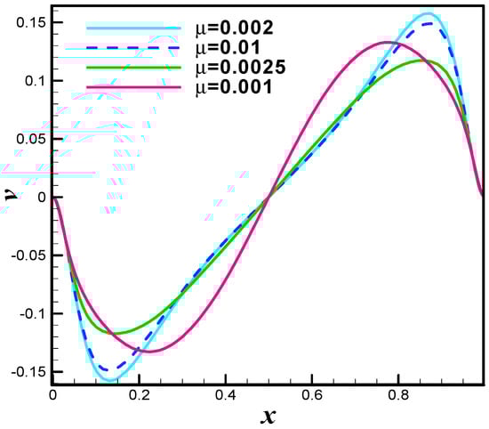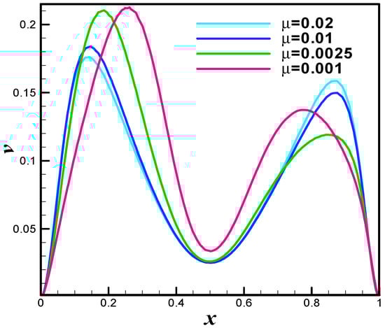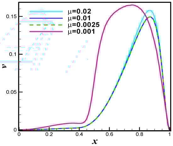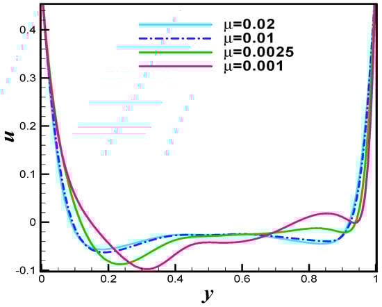 The Figure 19 is u-velocity line graph at different values of µ = 0.02 (Re = 25), µ = 0.01 (Re = 50), µ = 0.0025 (Re = 200), and µ = 0.001 (Re = 500). The significant variation in the u-velocity is observed. Similar is the case for the v-velocity line graph see Figure 20. In case-II we assumed that the both top and bottom walls are moving in parallel with velocity and left and right walls are taken at rest. The velocity distribution is evaluated at level-9 for better accuracy. Figure 21 depicts the velocity distribution at Re = 50. Once can see that the uniform trends are observed in both upper and lower region of staggered cavity. The total of four secondary vortices in the left and right corners of the top and bottom wall and two primary vortices are appeared. The velocity distribution is inspected at Re = 100. The Figure 22 is evident in this direction. One can see that the secondary vortices becomes more visible. The velocity distribution at Re = 400 and Re = 1000 is examined and offered with the aid of Figure 23 and Figure 24 respectively. One can see that the increase in Reynolds cause significant deformation in primary and secondary vortices. The pressure distribution when upper and lower walls of staggered cavity are moving parallel is examined at various of Reynolds number. The adopted values of Reynolds number are Re = 50, Re = 100, Re = 400 and Re = 1000. To be more specific, the Figure 25 offers pressure plot at Re = 50. One can see that the pressure seems maximum at corns points of cavity. Figure 26, Figure 27 and Figure 28 are the pressure examination at Re = 100, Re = 400 and Re = 1000 respectively. It is observed that the higher values in Reynolds number results dense pressure at corns of staggered cavity. The Figure 29 is u-velocity line graph at different values of µ = 0.02 (Re = 25), µ = 0.01 (Re = 50), µ = 0.0025 (Re = 200), and µ = 0.001 (Re = 500). The significant variation in the u-velocity is observed while line graph study as v-velocity towards µ = 0.02 (Re = 25), µ = 0.01 (Re = 50), µ = 0.0025 (Re = 200), and µ = 0.001 (Re = 500) is offered in Figure 30. It is noticed that the v-velocity reflects inciting values towards higher values of Reynolds number. The case-III defines the antiparallel motion of the top and bottom wall with same velocity. The finite element simulation is performed by carrying hybrid meshing as a level-9. The primitive variables namely, the velocity and pressure are inspected towards higher values of Reynolds number. The adopted values of Reynolds number are Re = 50, Re = 100, Re = 400 and Re = 1000. In detail, the Figure 31 shows the velocity distribution at Re = 50 when the upper and lower walls are moving antiparallel. The primary and secondary vortices are formed in both upper and lower region of staggered cavity. The streamlines intersect at center region of cavity. The velocity distribution at Re = 100 is observed and offered in terms of graphical trend see Figure 32. One can see that the additional loop as a vortex is formed at the central region of staggered cavity.