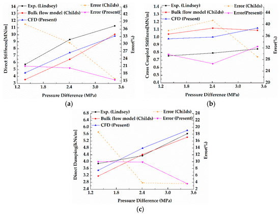 - Dietzen, F.J.; Nordmann, R. Calculating Rotordynamic Coefficients of Seals by Finite-Difference Techniques. J. Tribol. 1987, 109, 388–394. [Google Scholar] [CrossRef]