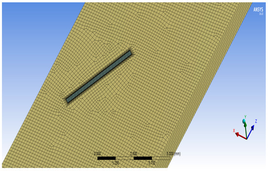 Commercial software for computational fluid dynamics ANSYS Fluent Software Release 16.0 was used to perform the simulations. Using ANSYS Meshing the meshes of the non-uniform grid for the computational domains. The grid generation of the model is shown in details in Figure 2 and Figure 3. The COUPLED algorithm was used for the pressure–velocity coupling based on the following reasons: First, by using it the approximations associated were eliminated in comparison to the segregated solution method, such as SIMPLE and SIMPLEC. Secondly, it reduces the errors that caused and related to physical model nonlinearities, the initial conditions and meshes that have been stretched and skewed [60]. The solution converges when the residual values are less than 10−6 for the momentum equation, 10−6 for the continuity equation and 10−8 for the energy equation.