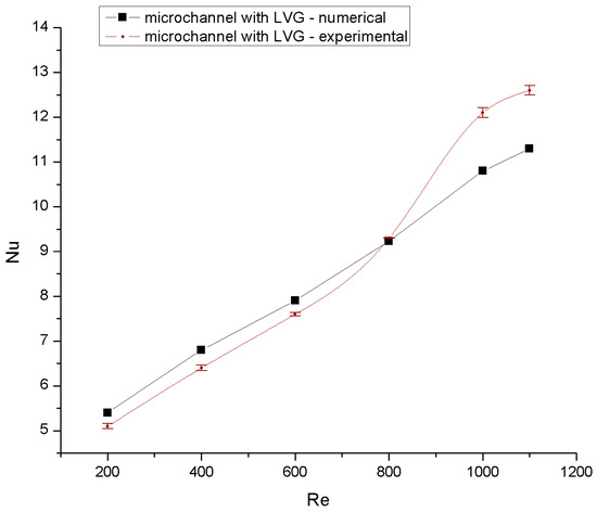 In order to keep the simulation accurate with reasonable computational costs, a grid independence test was performed on four grids with different sizes as shown in Table 3. The tests were performed on A1 configuration with β1, β2 angle of 30° each using pure water as a working fluid under Re = 800. It can be seen from the result shown in Table 3 that there is a small difference between (490198) grid and (931236) grid in the computed results which was 0.038 and 0.034, respectively, hence the (490198) grid was selected for further simulations. The results were validated based on the experimental results presented by Liu et al. [25]. They used in their study deionized water was a working fluid with Reynolds number in the range of 170 to 1200. The bottom wall of the microchannel was maintained at a constant temperature of 323 K. Figure 4 and Figure 5 illustrate a comparison between Nu and f values from the present numerical simulation and the experimental results of Liu et al. [25]. It can be seen from these figures that the maximum and minimum deviations were 11.5% and 3.8%, respectively, for the Nu values while the maximum and minimum deviations were 13.34% and 2.7%, respectively, for the values of friction factor. Liu et al. [25] reported that the average uncertainties are caused by the equipment that has been used in determining the Nu number for the microchannel with and without LVGs is 19.6% and 12.8%, respectively.