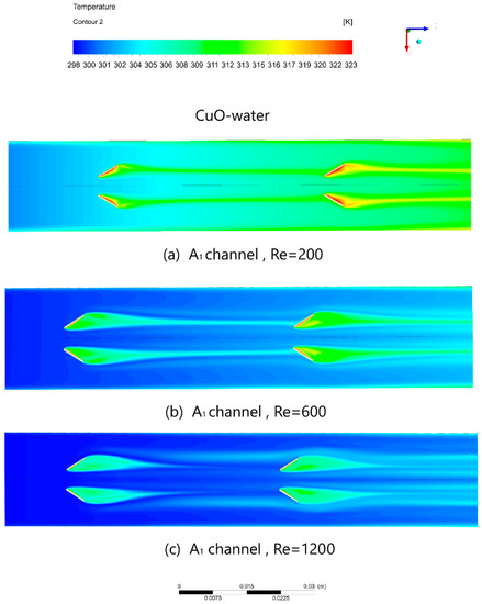 The numerical computations were conducted for five different geometrical configurations on the thermo–hydraulic performance of microchannels with VGs and compared to the smooth microchannels using an Al2O3–water nanofluid as a working fluid. In this case, the effects of the nanofluids with different nanoparticle types (Al2O3 and CuO) and different base fluid (water, PAO and ethanol glycol) with a nanoparticles volume fraction of 2% and various nanoparticles diameters (29 nm and 28.6 nm) were tested using A1 configuration and compared to pure water. The effects of different geometry configurations and Reynolds numbers on the temperature and velocity distributions, Nusselt number, fanning friction coefficient and JF performance factor for different Reynolds numbers are interpreted and presented in this section.