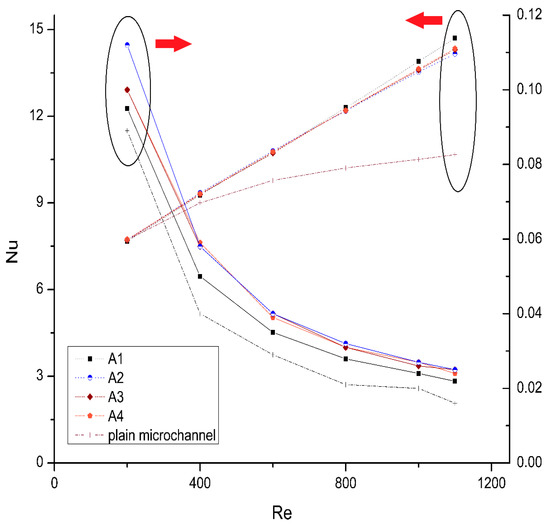The Nusselt number and Fanning friction factor variations for different configurations for various Reynolds numbers using Al2O3–water as a working fluid are presented in Figure 10. It can be obviously seen that the Nusselt number for different configurations of the microchannels with a longitudinal vortex generator is greater than the plain microchannels in all ranges of the Reynolds numbers. It is found that the Nusselt number improved by 0.9%–28.1%. It is also noticed that when Reynolds number increases the Nusselt number increases as well. This can be explained as follows: By increasing the Reynolds number, the vortices become more powerful, which augment the fluid mixing and boost the swirl. It is observed that when the Re number reaches approximately 800, a rapid change in Nusselt number for A1 starts to occur. It can be explained that the longitudinal vortex generator with an acute angle of attack on the first row induces more powerful vortices in comparison to the ones with the obtuse angle of attack. As the Reynolds number increases, the vortices generated in the microchannel become stronger, which causes the decrease in thermal boundary thickness and increase in flow disturbance which improves the swirl in the microchannel.