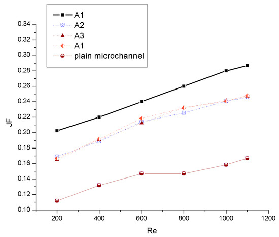JF factor versus Reynolds number for various microchannel configurations.