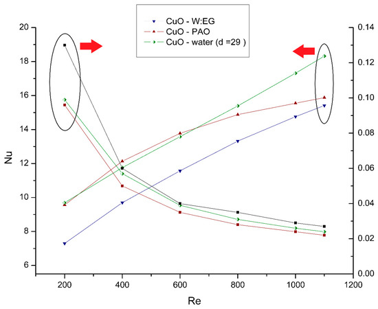 Figure 12 demonstrates the effect of changing nanoparticle material on the Nu number and Fanning friction factor for a range of Reynolds numbers and the particle diameter of 29 nm and 28.6 nm. It can be clearly seen that there is a directly proportional relation between Nu number and Re number for all working fluids in the present study. It can be explained that nanofluids have greater heat absorption and the use of metallic nanoparticles increases the thermal conductivity of the mixture, with a larger heat transfer surface area, and thus increases the collision rate of the nanoparticles that increases the nanoparticles’ Brownian motion [45]. The increase in thermal conductivity leads to intensive energy transfer, which dominates the diffusion in the working fluid and causes greater bulk temperatures. It is found that CuO–water shows a greater increase in heat transfer compared to Al2O3–water at the same volume fraction and Reynolds numbers; that can be attributed to the fact that CuO nanoparticles have higher thermal conductivity with the comparison to Al2O3 nanoparticles as well as by the effects of the alignment, structure and interactions of the nanoparticles [49].