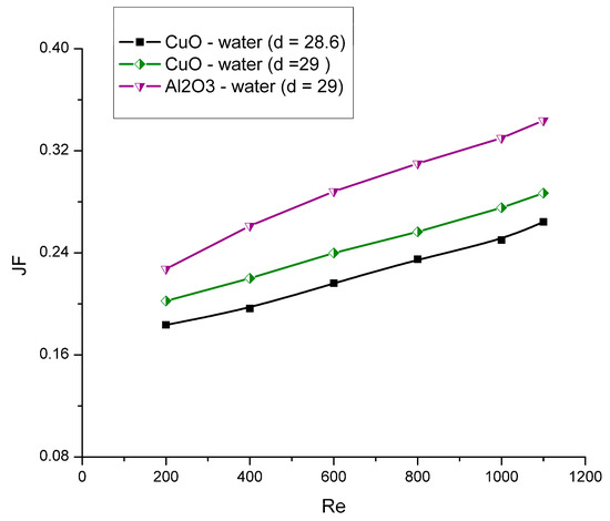 The effect of different nanoparticles and Reynolds number on the JF factor.