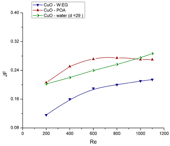 As shown in Figure 14, the results indicate that Al2O3–water nanofluid has the highest JF factor compared with another nanofluid in the considered Reynolds numbers range; that indicates that Al2O3–water has the best performance in terms of high Nusselt number with a low friction factor among all nanofluids. With regard to the base fluid, the results revealed that CuO–PAO has the highest JF factor in the range of Re number between 200 and 1000, but in a high Reynolds number range between 100 and 1200 the JF factor decreases, which make the CuO–water nanofluid to have the highest JF factor as shown in Figure 15. In almost all the range of Reynolds number in the present study, CuO–water has an increase with respect to the increase in Reynolds number while CuO–W:EG keeps having the lowest JF factor values.