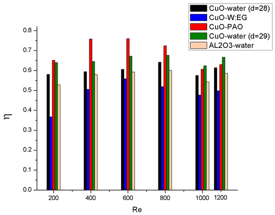 The use of nanofluids as working fluids in microchannels with longitudinal vortex generators cause an observable enhancement in overall thermal performance. Figure 16 represents the summary of thermal performance percentage of the A1 configuration microchannels with various nanofluids for different Reynolds numbers. According to Figure 16, the higher overall thermal performance is observed for the CuO–PAO, CuO–water and Al2O3–water nanofluid, in an ascending order. Furthermore, across the range of Reynolds numbers used in the present study CuO–W:EG showed the lowest overall thermal performance. The CuO–PAO shows the best overall performance because it is due to the highest Nu number and lowest friction factor. It is worthy to mention that the oil in the POA reduced the pressure drop in the channel and the CuO particle increased the thermal properties of the oil, which increased the Nu number. According to previous result, the proposed CuO–PAO nanofluid has a promising solution to solve the problem of a high pressure drop in the microchannel since it also has one of the lowest Fanning frictions due to the lubrication effect of its base fluid.