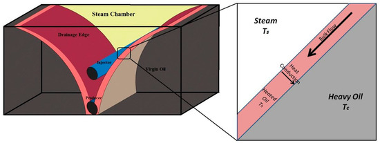 It goes without saying that available oil contents are recognized as an unsustainable source of fuel energy in the world, and it will not take a long time for whatever remains in conventional oil reservoirs to run out. As a result, the global demand will be more inclined toward exploiting heavy oil reservoirs, a confident energy source after the conventional one. In contrast to several other reservoir types, such as light shale reserves, where enhanced oil recovery (EOR) applications can be implemented after the primary production stage, Steam-assisted gravity drainage (SAGD) operators tend to start the process after the wells are completed. As has been vastly delineated in the literature, because it has viscosities that are too high, the oil in heavy oil reservoirs cannot move naturally. Thus, researchers have been developing various methods to give companies the ability to practically deal with the problem [1,2]. Among the different methods, it appears that thermal methods are more convincing than others. One of the thermal methods, which has a huge reputation in extracting heavy oil, is the SAGD process (or its variations). Figure 1 shows a simplified demonstration of this process. As can be seen, the reservoir is drilled with at least a pair of horizontal wells for the SAGD process to progress [3]. Steam is injected from the upper horizontal well (named injector) and the heated oil is summoned up from the well located at the bottom of the reservoir (named producer). The role that steam plays is to transport heat to the viscous, cold areas in the pay zone. There, the conduction mechanism has its foremost effect in heating the untouched oil. While the untouched heavy oil gradually becomes warmer, its viscosity sharply decreases and consequently, thanks to the gravity force, flows down toward the producer [4].