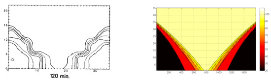 Equation (A6) from the first case and Equation (A8) from the latter have similar general forms. In both, the temperature gradient is inversely proportional to the heat penetration. Therefore, Butler assumed that the real equation for heat penetration depth lies between these two cases, so this premise leads to the following equation: