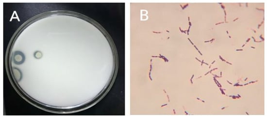 (A) Milk screening medium at 37 °C for 48 h; (B) Microscopic morphology of bacterial isolate cultured in LB liquid medium at 37 °C, 150 rpm for 24 h.
