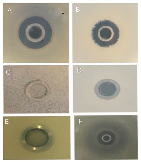 Inhibition zone of pathogenic bacteria, (A) Staphylococcus aureus, (B) Escherichia coli, (C) Yeast, (D) Salmonella typhimurium (E) Water, and (F) Kanamycin.