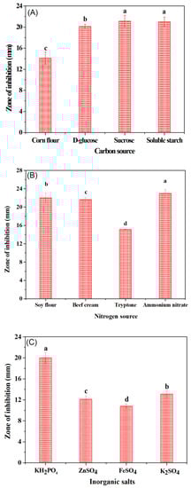 Effects of different (A) carbon sources (B) nitrogen sources and (C) inorganic salts on the antibacterial potential of B. subtilis natto.