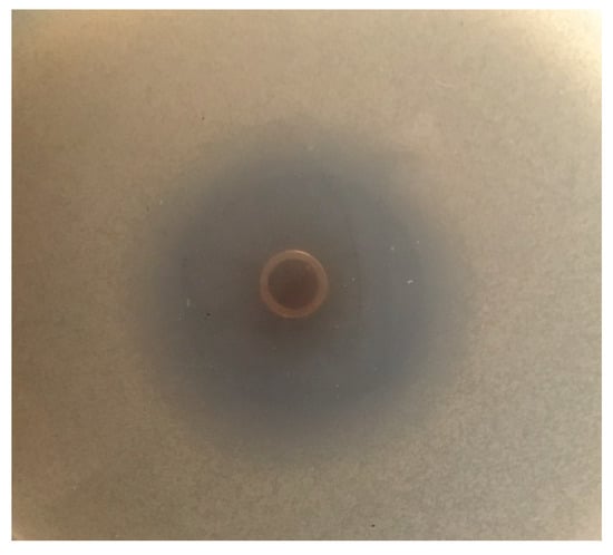 B. subtilis natto has a unique potential to secrete bactericidal compounds of high interest. For such reason, a cell-free extract of freshly grown B. subtilis natto was used to test the inhibitory activity towards E. coli, S. aureus, S. typhimurium, and yeast. Briefly, around 100 mL liquid seed medium was inoculated with a 5% of freshly grown B. subtilis natto inoculum suspension. The inoculated seed medium was incubated at 37 °C for up to 48 h under uninterrupted shaking at 160 rpm. After 48 h incubation, the fermented broth was centrifuged at 4000× g for 15 min, and the cell-free supernatant was further filtered through a 0.45 μm polysulphonate membrane filter. The resulting filtered cell-free supernatant was considered as a bactericidal containing crude extract and tested using the agar well diffusion assay against selected strains. Briefly, sterilized discs were gently placed onto the center of the agar plate with sterile forceps following the addition of 20 μL of bactericidal containing cell-free supernatant to the discs. The inhibition zone diameter (mm) formed around the disks was recorded after the plate’s incubation at 37 °C for 24 h []. Kanamycin at the concentration of 30 μg/mL, and water ware used as a positive and negative control, respectively.