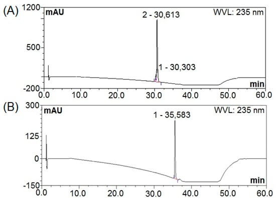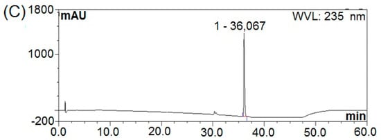 The fermentation broth obtained from B. subtilis natto under optimized cultivation conditions was harvested by centrifugation at 4000× g and 4 °C for 15 min. The resultant cell-free supernatant was mixed with ethyl acetate and subjected to the rotary evaporator to obtain a concentrated extract. The resulting extract was subjected to silica gel vacuum liquid chromatography, which yielded three fractions. Among these, fractions A-4 and A-5 presenting inhibitory activity towards E. coli and S. aureus were further separated using a Sephadex LH-20 column to remove pigments and then purified by a semi-preparative HPLC into three fractions designating as NT-5, NT-6, and NT-7 (Figure 5). As evident from the HPLC pattern, the fractions NT-5, NT-6 and NT-7 were 100% purified with the retention time of 30.613, 35.583 and 36.067 min, respectively.