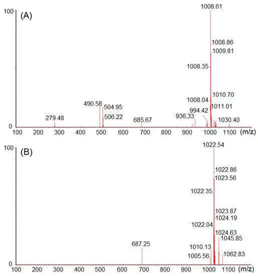 The structural elucidation of purified bactericides designated as NT-5, NT-6 and NT-7 were further confirmed by 13C NMR analysis at 150 MHz. 13C-NMR displayed different peaks for each tested fraction, which are summarized in Table 4. Compound NT-5 eluting at 30.613 min in the HPLC analysis displayed a protonated molecular ion [M+H]+ at m/z 1008.6 (Figure 6A). Compound NT-6 eluting at 35.583 min in the HPLC analysis showed a protonated molecular ion [M + H]+ at m/z 1022.5 (Figure 6B). Compound NT-7 eluting at 36.067 min in the HPLC analysis and revealed a protonated molecular ion [M + H]+ at m/z 1036.8 (Figure 6C). The NMR data of NT-5, NT-6, and NT-7 summarized in Table 4 were consistent with the literature [] and verified that NT-5, NT-6, and NT-7 has an inhibitory effect on E. coli and Staphylococcus aureus (Figure 7). The proposed structures of three active compounds are portrayed in Figure 8.