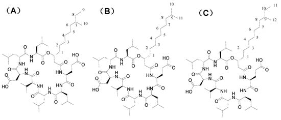 - Yakimov, M.M.; Timmis, K.N.; Wray, V.; Fredrickson, H.L. Characterization of a new lipopeptide surfactant produced by thermotolerant and halotolerant subsurface Bacillus licheniformis BAS50. Appl. Environ. Microbiol. 1995, 61, 1706–1713. [Google Scholar] [CrossRef] [PubMed]