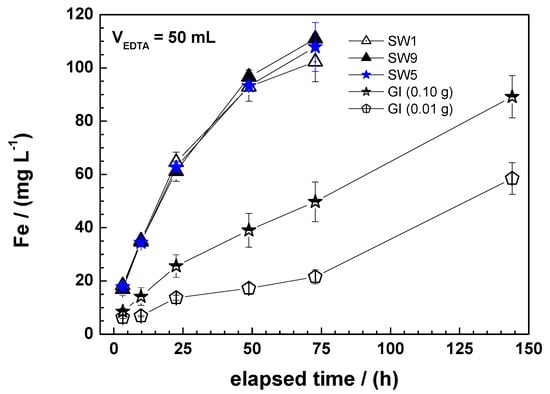Figure 2 clearly shows that GI is dissolved with a far lower dissolution rate than the three presented SW specimens. Two different masses of GI are used (0.1 and 0.01 g) while the used mass of SW was 0.01 g. With regard to the linearity of the [Fe] = f(t) function, it is evident that longer experimental durations are needed for GI (up to four days) while SW characterization is achieved within 24 h. Previous works have demonstrated that the linearity of Equation (1) is difficult to be obtained with fine Fe0 materials and with those covered with iron corrosion products. The reason being that EDTA dissolves FeIII species as well [12]. The next section presents the tools utilized herein to obtain reasonable kEDTA values. It should be explicitly stated that Figure 2 illustrates the differential behaviour of SW and GI. The expected trend of more rapid Fe dissolution from smaller particles is documented. The next result is that material of diverse coarseness cannot be characterized under the same experimental conditions using the EDTA test [12].
