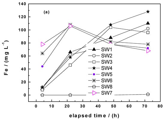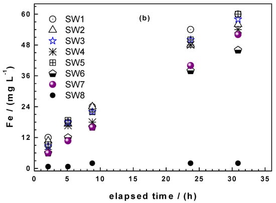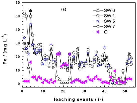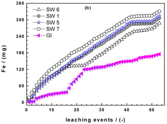 Figure 4a shows that the four Fe0 SW exhibited markedly increased iron dissolution during the whole experiments (53 leaching events) than GI. It is also seen that there are picks in the iron concentration. Hildebrant [45] demonstrated that the picks did not correspond to longer standing times (e.g., weekends values with 72 h of equilibration). It is also seen that the saturation value (112 mg L−1) for iron was never achieved. The last important observation from Figure 4a is that there are waves in the kinetics of iron dissolution. The most remarkable pick is the one for GI around the 20th leaching event. Here, GI suddenly release more Fe than SW6 which is the most reactive material according to the kEDTA values. It is not worth trying to rationalize this behaviour, it is enough to document it at this stage and look in the future if such results are reported. Similarly as the EDTA test, absolute Fe concentrations are needed to differentiate the reactivity of the Fe0 SW.