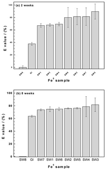 Extent of methylene blue discoloration for SW1–SW8 and GI after (a) two weeks and (b) eight weeks. Experimental conditions: 0.05 g Fe0; V = 22 mL; [MB] = 10 mg/L; rotational shaking at 75 rotations per min.