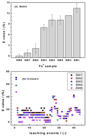 Figure 5a summarizes the results of MB discoloration after two weeks. It confirms that SW8 is not reactive and Fe0 SW perform better than GI. From the Fe0 SW specimens, SW5 performed the best. SW1, SW3, and SW4 were very similar in their E values and performed slightly lower than SW6, SW2, and SW7. It is recalled that only grade 00 (fine—d = 40 μm) materials were used in column leaching experiments (Table 1), together with GI. The order of efficiency as related by the mean E values is the following: