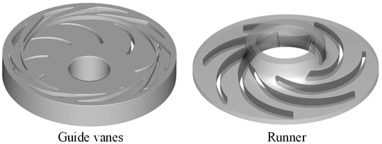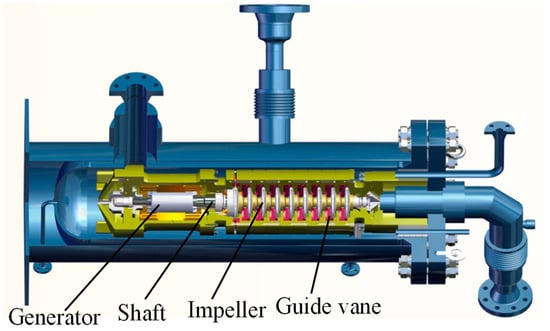 The cryogenic expander studied in this paper is shown in Figure 1 and Figure 2, including the generator, shaft, runner, and guide vanes. The designed flow rate of the expander is 40 m3/h, the designed head of the runner is 98 m, the designed speed is 3000 rpm and the hydraulic efficiency is 74%. The parameters of the LNG cryogenic expander are listed in Table 1.