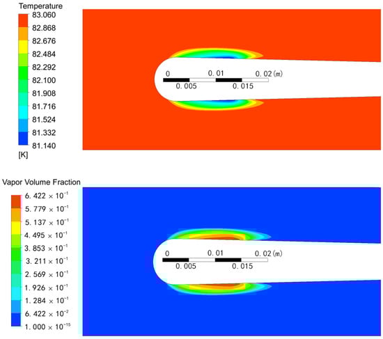 The computed temperature and vapor volume fraction contours.
