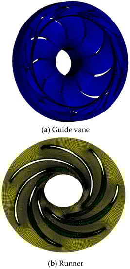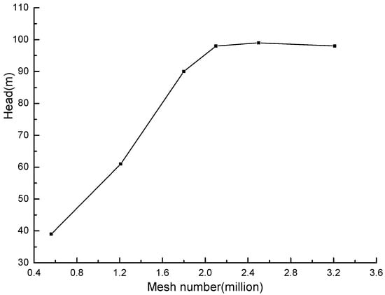 The whole calculation basin of the LNG cryogenic expander was meshed by the ANSYS ICEM software (SAS IP, Inc., Pittsburgh, PA, USA). The meshing is shown in Figure 6, and Figure 7 presents the grid independence. It is shown that the head changes a little when the total grid number is higher than 2.57 × 106. The final calculation grid model is guide vane 1.37 × 106, runner 1.20 × 106, draft tube 0.50 × 106.