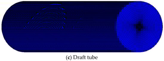 The flow in the draft tube of rotating machinery is also the focus of research. Liu [] used the dynamic grid method to catch the pressure fluctuations in a pump–turbine draft tube. In the study by Zhang [], the vortex identification methods were reviewed to reveal the complex vortex structures in hydroturbines. Arispe [] used the computational fluid dynamics (CFD) method to obtain a draft tube geometry that improved the hydrodynamic performance. The pressure fluctuations generated by vortex ropes in the draft tube were studied when hydraulic turbines operated at off-design conditions [].