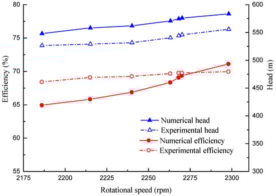 Because LNG is very dangerous, in our experiment, using liquid nitrogen as the medium, the flow rate of the expander is constant, and the expander performance under different operating conditions is obtained by changing the speed of the expander. The enclosed layout of the expander model test rig is presented in Figure 8. The density of the liquid nitrogen is 808 kg/m3 and the temperature is 77 K. The numerical simulation results of the LNG expander are compared with the experimental results in Figure 9. From the comparative analysis, we can see that in the range of working conditions, the numerical simulation results are in good agreement with the test results, the error between the simulation result and the test result at the design point is 1.5%, and the errors at low-speed and high-speed conditions are both less than 10%. Therefore, the numerical simulation results are reliable.