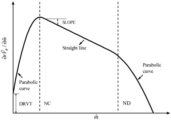 When using TURBOdesign 5.2 to design runner blades, blade loadings were the most important parameters in determining the blade shape [,,]. Blade loading distributions were given along the hub and shroud streamlines. The runner blade loadings of the hub and shroud were determined by using linear interpolation. The blade loading distribution is shown in Figure 10. Along each streamline, a three-segment distribution was adopted, including the loading at the leading edge of the runner blade DRVT, the linear slope SLOPE and connection point locations NC and ND. In the optimization process, extensive trial designs were made to check whether runners with reasonable shapes could be obtained. After these trial designs, three variables were fixed at , , and , where subscripts h and s refer to hub and shroud, respectively, and the variation ranges of the other runner blade variables were determined as shown in Table 2.