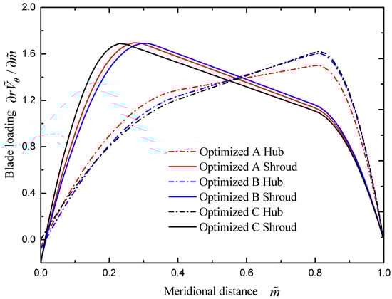 Table 5 shows the runner blade loading of the optimized models chosen on the Pareto curve. As shown in Figure 13, the blade loading distributions, which show great similarity, are aft-loading and fore-loading on the hub and shroud for runners A, B, and C. Figure 14 shows the runners’ shapes.