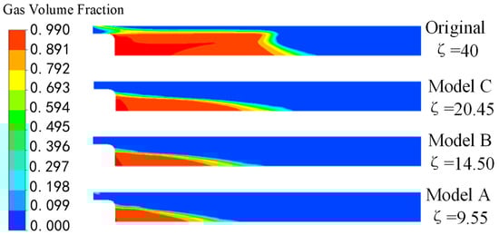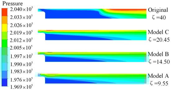 The pressure and gas volume fraction distribution in the draft tube of the three runner models and the original model are shown in Figure 15 and Figure 16. When the low-pressure area in the draft tube is large, the cavitation is serious, and the gas distribution area is large. Through the calculation of the numerical simulation results, when the cavitation is serious, the energy loss coefficient in the draft tube is larger, when the energy loss coefficient is small, the distribution of the low-pressure area in the draft tube is smaller, and the cavitation can be better suppressed. It is proven that the energy loss coefficient can reflect the severity of cavitation in the draft tube.
