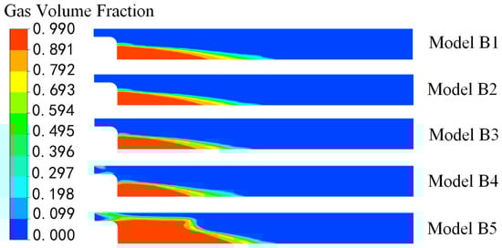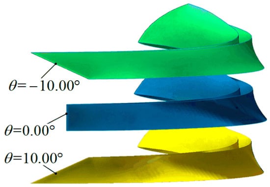 Based on the optimization results, more runners with the same blade loading distribution and different blade lean were designed to be investigated. Table 6 shows the blade loading distribution, with the blade lean ranging from −10° to 10°, as shown in Figure 17. Figure 18 shows the gas volume fraction in the draft tube, and the energy loss coefficients are also listed in Table 6.