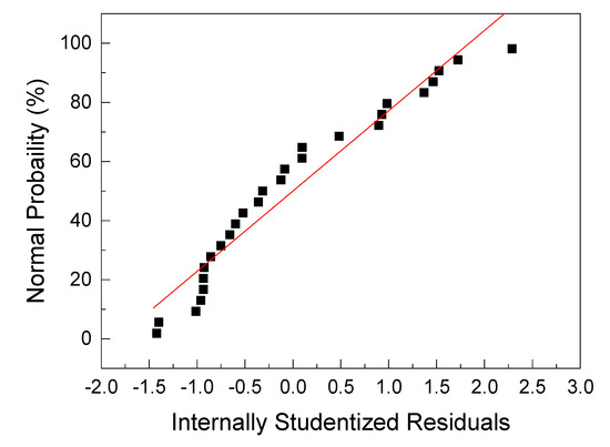 The internally studentized residuals and normal probability plot of GA removal by MIEX resin are shown in Figure 1. In general, the residuals were calculated from the difference between the experimental value and the predicted value. The normality analysis of the residuals of the quadratic polynomial model was used to determine whether the model satisfies the assumptions of ANOVA [43,44]. Figure 1 shows that the experimental results are distributed normally. Accordingly, the established model equation in this study is reliable and can be used to predict the adsorption of GA on MIEX resin in the experimental range.
