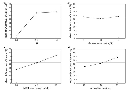 Main effect plots of four parameters for GA removal efficiency (%). (a) solution pH; (b) GA concentration; (c) MIEX resin dosage; (d) adsorption time.