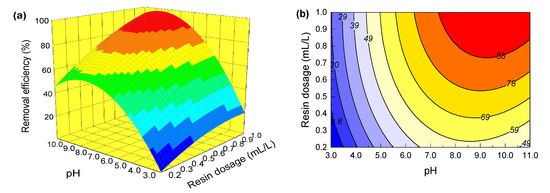 Figure 3 gives the combined effects of the interaction between solution pH and MIEX resin dosage on GA removal under the condition of 10 mg GA/L and a 40 min adsorption. It can be seen from Figure 3a that the removal efficiency of GA increases with an increase of solution pH and resin dosage. The high pH is helpful for the removal of GA, a fact that could be explained by the formation of anion-led GA exchange with chloride occurring on the active sites of MIEX resin [48]. The more MIEX resin particles supply, the more available active sites, thus promoting GA removal [5]. In contrast, solution pH contributes more than resin dosage to GA removal. In respect of the contour plots, an elliptical or saddle shape implies that the interaction between variables is significant [49]. From this perspective, it can be seen obviously from Figure 3b that the effect of interaction between solution pH and MIEX resin dosage is significant. Figure 3b further shows that the optimal GA removal rate (97.55%) occurs at a solution pH of 9.6 and a resin dosage of 1.0 mL/L.