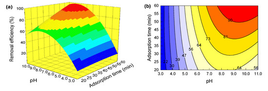 The response surface and contour plots are depicted in Figure 4 to reflect the effect of the interaction between solution pH and adsorption time on GA removal under the constant conditions of a GA concentration of 10 mg/L and an adsorption time of 40 min. It can be seen from Figure 4 that the interaction between solution pH and adsorption time has a significant effect on the removal of GA. The efficiency of GA removal increases rapidly with an increase in pH from 3.0 to 7.0, then decreases slightly with an increase in pH to 11.0. Additionally, the effect of solution pH is much more significant than that of adsorption time. The removal rate of GA attains the maximum of 97.91% at a pH of 9.8 and an adsorption time of 60 min.