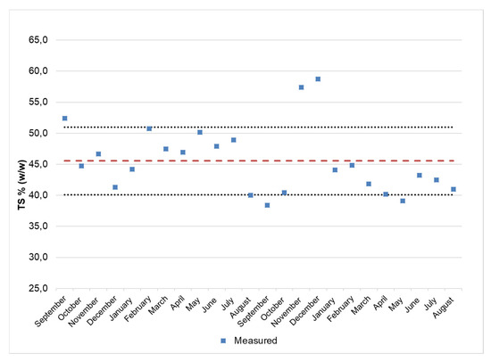 In order to ensure the representativeness of the LF samples used in the research activities, the evolution of the total solid content (TS) of this material was studied for more than two years before the starting of the project (Figure 1). The analysis indicated an average TS of 45.54% weight/weight (w/w) and a standard deviation of 5.45%. Since the average TS of the samples collected for the research was in this range (48.68% ± 1.98% w/w), these samples were considered representative of the LF produced and have been used in the trials.